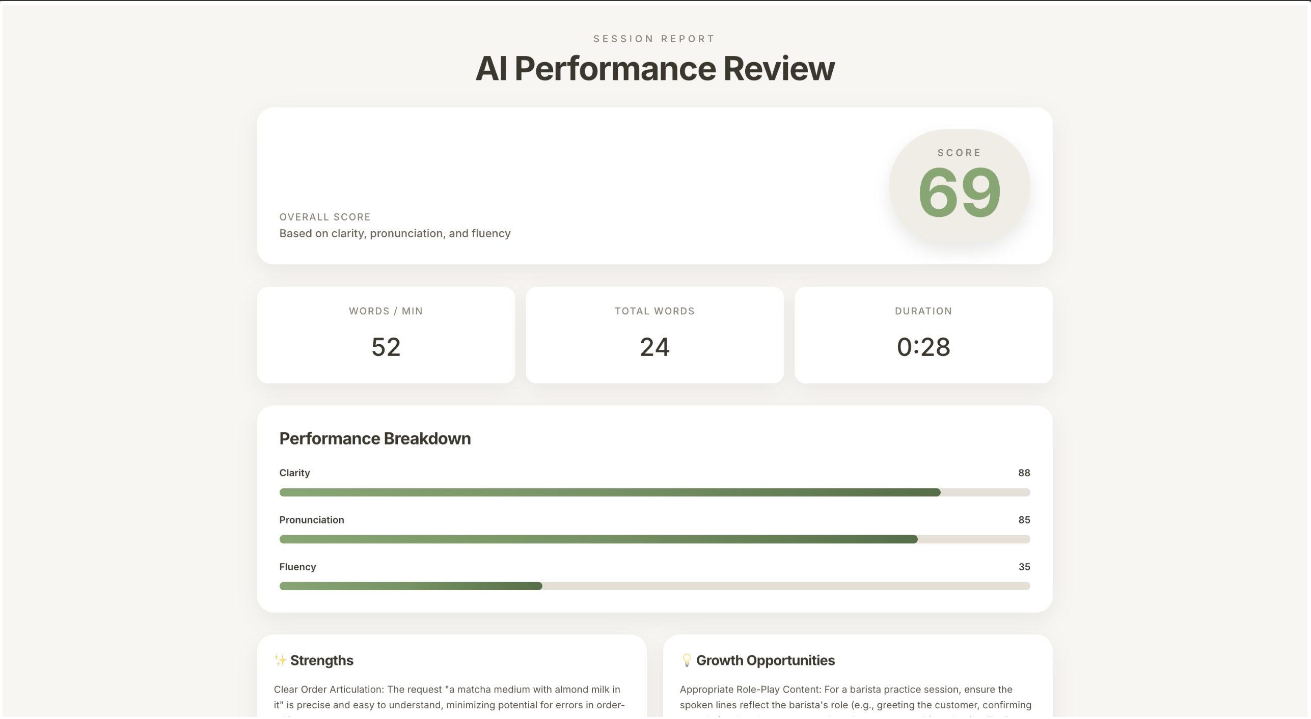 speech recognition behaved differently across chrome and safari, so we added careful timing and fallback handling. keeping the timer, simulator, transcript panel, and audio playback smooth at once took real tuning. the feedback had to motivate without sounding like a grade.